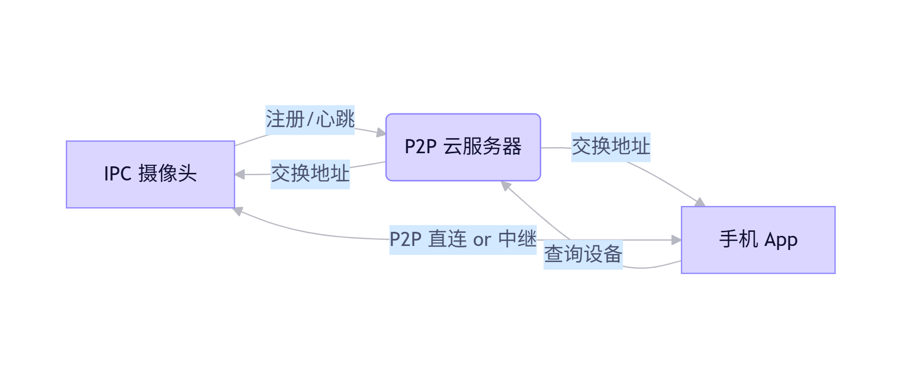 - 视频流路径 :优先走 IPC ↔ 手机直连 ,失败则走 中继服务器。