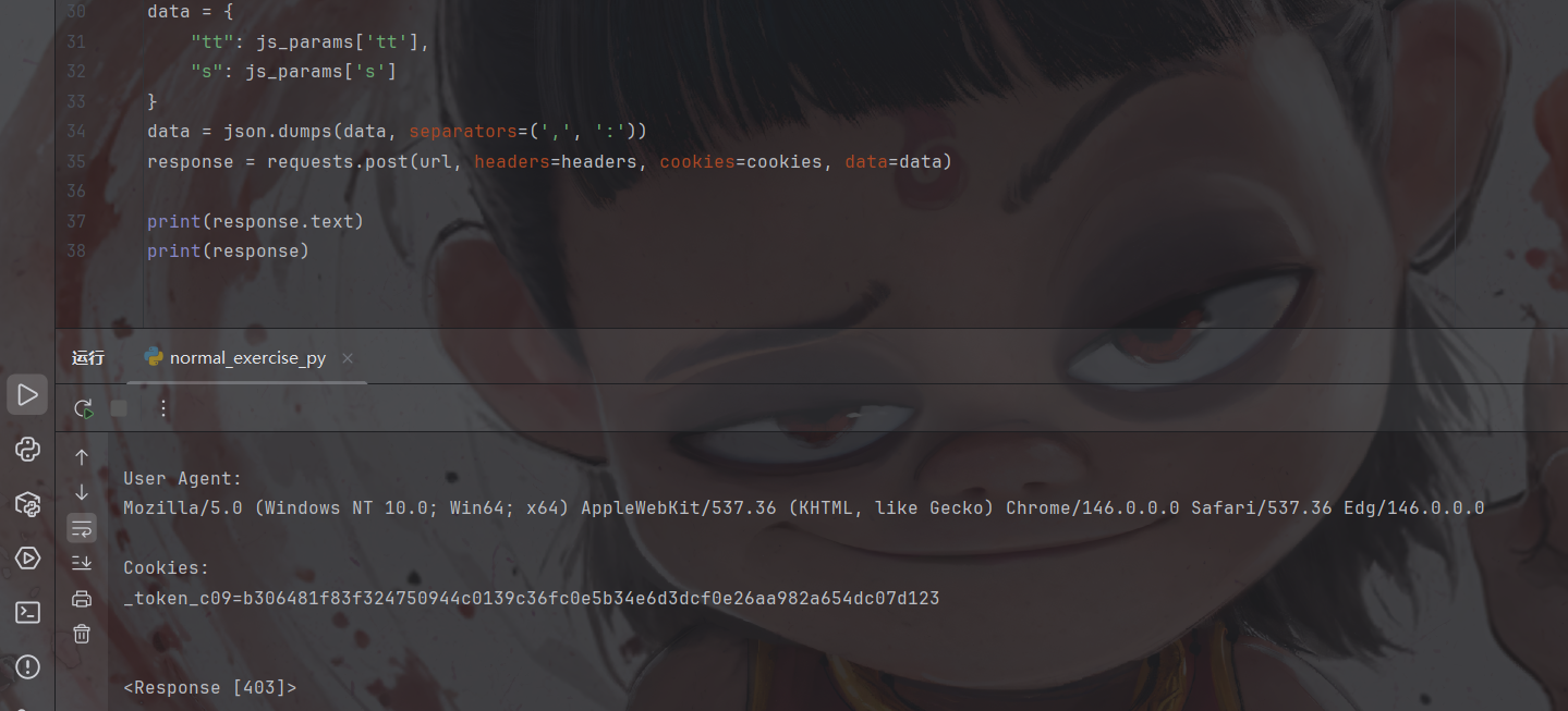 这里看不出来,可能是参数时效性太短或者是参数只能用一次,那我们只能根据是否是密文+是否变化+经验来大致判断,这里s肯定是需要逆向的,cookies中的token可能需要,先不管,等s逆向出来后依旧得不到数据再一个个加即可
