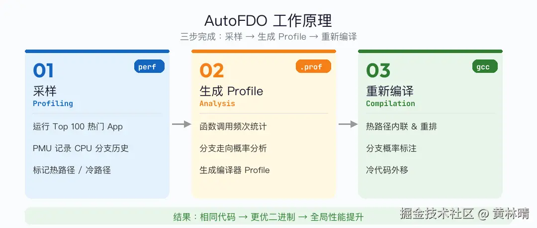 核心思想很直接:先跑一遍真实场景,记录 CPU 到底在执行什么,然后根据这些数据重新编译。