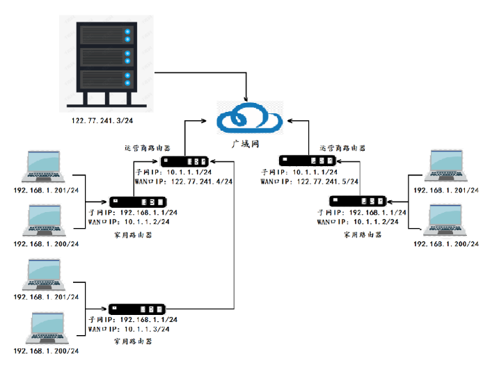 在下图,每一台家用主机都有自己的私有IP,如果要传输一个报文到服务端,那么就要先把报文交给家用路由器,再交给运营商路由器,发送到公网,才能转发到服务端,但这需要一个前提,否则私有IP就会被传输到公网中,所以,子网IP(也被称为LAN口IP)相当于是私有IP,WAN口IP相当于是公网IP,由于家用路由器和运营商构成一个子网,所以家用路由器的WAN口IP就相当于运营商的一个内网IP,当路由器要把一个报文转发出去的时候,会把源IP转化为WAN口IP,例如,一个报文要从192.168.1.201转发到122.77.241.3的时候,先是经过家用路由器,srcIP就变成10.1.1.2,destIP不变,当进入运营商路由器的时候,srcIP就变成122.77.241.4,目的IP依旧不变,这样就可以交到122.77.241.4这台主机上,如果这台主机想把响应报文返回回去,就把srcIP和destIP换个位置,就可以正常返回报文,也可以避免内网IP在公网里传播,私有IP不断被替换的技术,就被称为NAT技术 ,这样,大家的内网IP就可以重复,最后就可以节省IP。