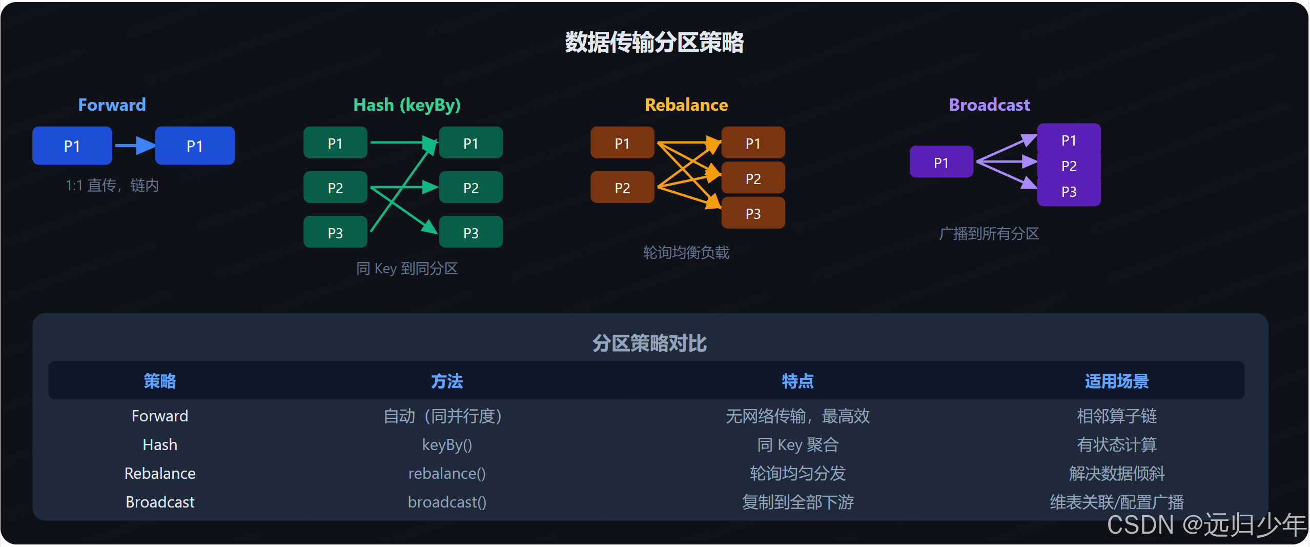 不同分区策略决定了上下游算子间的数据路由方式: