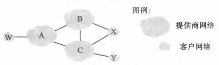 上图中显示了6 个互联的自治系统: A、 B、 C、 W、 X 、Y。 假设自治系统W、 X 、Y是接入ISP,而 A、 B 、C 是主干提供商网络。 A、 B、C直接向彼此发送流量,并向它们的客户网络提供全部的BGP信息。X 是一个多宿接入ISP,它是经由B、C两个不同的提供商连到网络的其余部分。X 如何防止转发B与C之间的流量呢?这能够通过控制 BGP路由的通告方式容易地实现。这就是说,即使X 可能知道一条路径(比如说XCY) 能到达网络Y, 它也将不把该条路径通告给B。所以B 绝不会经由 X转发目的为Y (或C) 的流量。 这个简单的例子说明了如何使用路由通告策略来实现客户/提供商路由选择关系。