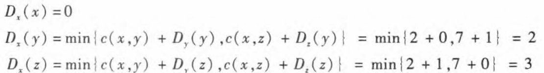 D y ( x ) = m i n ∣ c ( y , x ) + D x ( x ) , c ( y , z ) + D z ( x ) ∣ = m i n ∣ 60 + 0 , 1 + 5 ∣ = 6 Dy(x) = min |c(y,x) + Dx(x), c(y , z) + Dz(x) | = min |60 + 0 , 1 + 5 | = 6 Dy(x)=min∣c(y,x)+Dx(x),c(y,z)+Dz(x)∣=min∣60+0,1+5∣=6