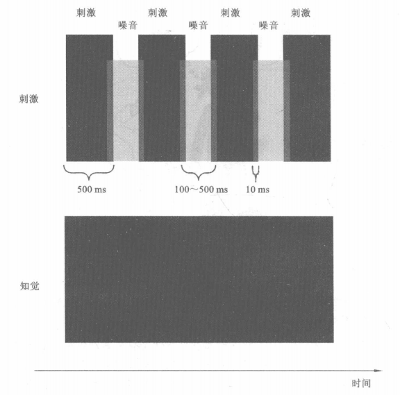 在一项实验中,在振动目标刺激(200 Hz正弦信号)中插入短暂间隙后,再用振动刺激噪音(其频率中心为200 Hz,范围为50~80 Hz)在间隙间进行填补,如图9。尽管刺激是不连续的,被试仍觉得该振动刺激目标是连续的(即刺激面的震动频率是均匀一致的)。该结果清晰地表明,在刺激呈现的特定条件下,人们会自动填充触觉刺激间的间隙。