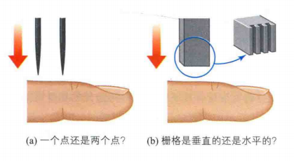 测量两点阈的方法是轻轻接触皮肤上的两个点(如用制图圆规的点),然后让被试报告他感觉到的是一个点还是两个点(图6(a))。两点阈是大部分早期触觉研究中测量敏度的主要方法(图(b))。后来又引入了一些其他方法。比如将栅格往皮肤上按压,然后让被试指出栅格的朝向,根据栅格之间最窄的间隔测量得出触觉敏锐度。