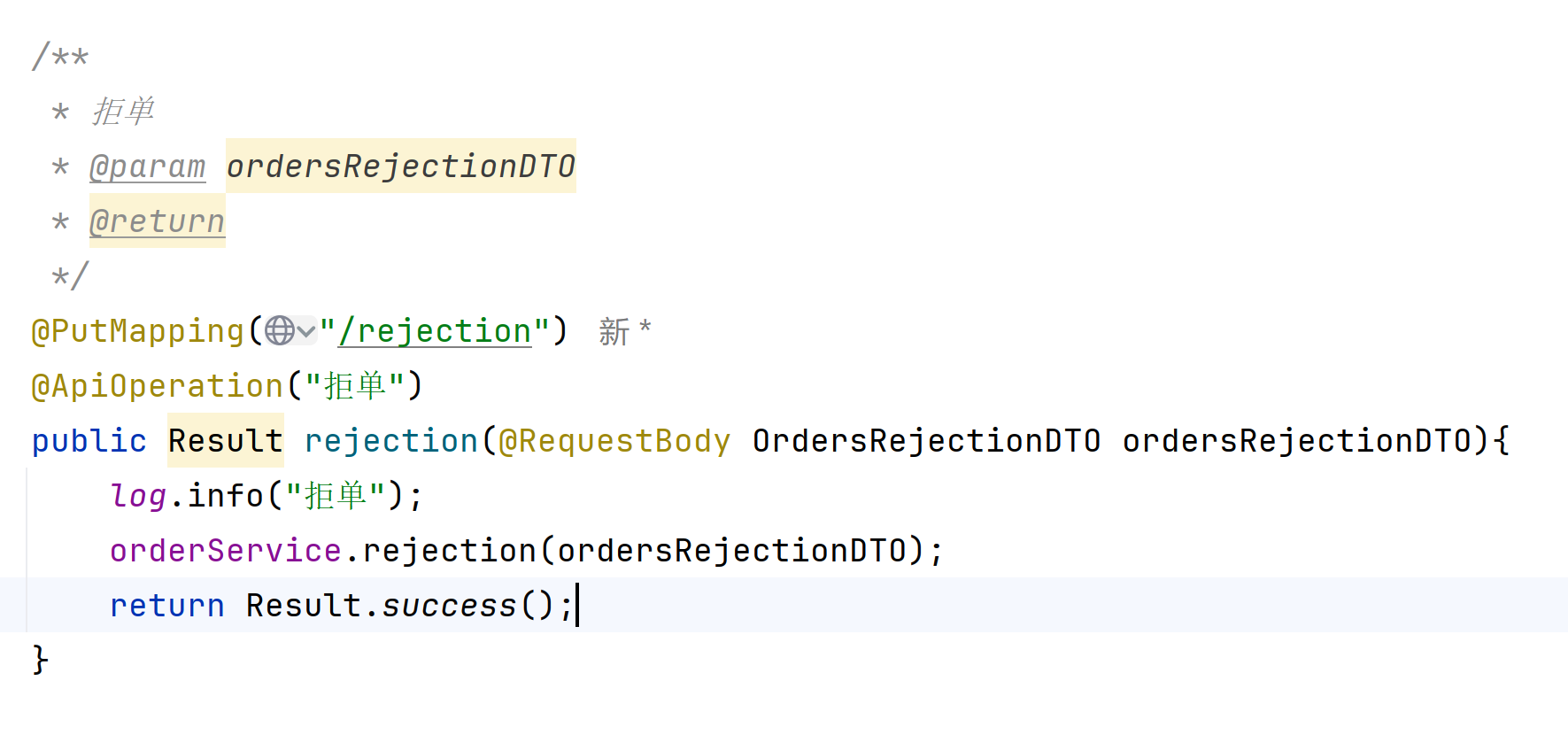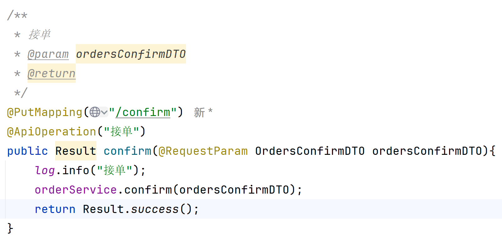 接单和拒单以及其他对于订单状态的修改都沿用了之前写好的update方法,提高了代码复用率、降低冗余字段。