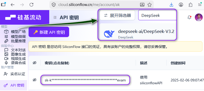 图4 常用硅基流动平台SiliconflowAPI密钥创建及其大模型选择组合截图
