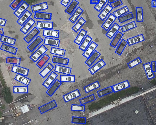 示例:图中蓝色框为传统水平框检测结果,红色为旋转框检测结果