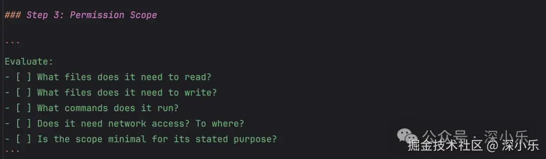 评估 Skill 到底需要访问哪些文件,执行哪些命令,发出哪些网络请求,判断是否"最小权限原则"。