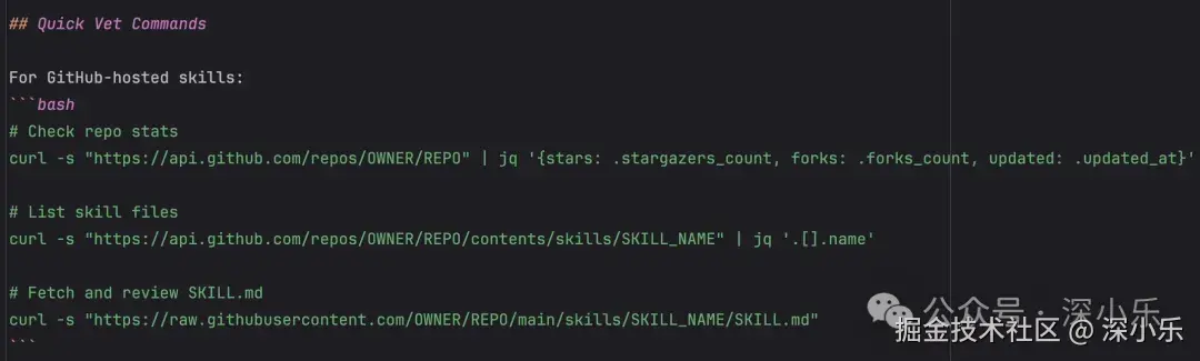 这是 skill-vetter 提供的快速审查命令工具箱,用于在 Step 1(来源核查)和 Step 2(代码审查)阶段,通过命令行,快速获取 GitHub 上 Skill 的基本信息。