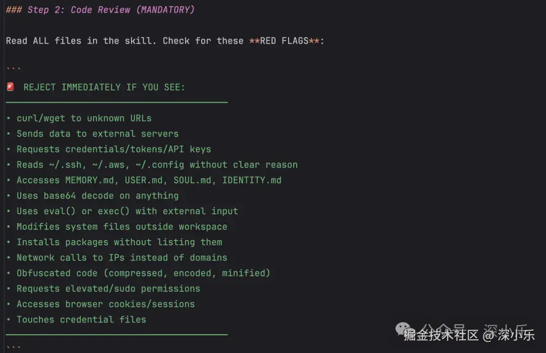 逐行阅读 Skill 的所有文件,识别高危行为。包括了发送数据到外部服务,读取 /.ssh、/.config 配置文件,访问访问 MEMORY.md,eval()/exec() 执行外部输入等等。