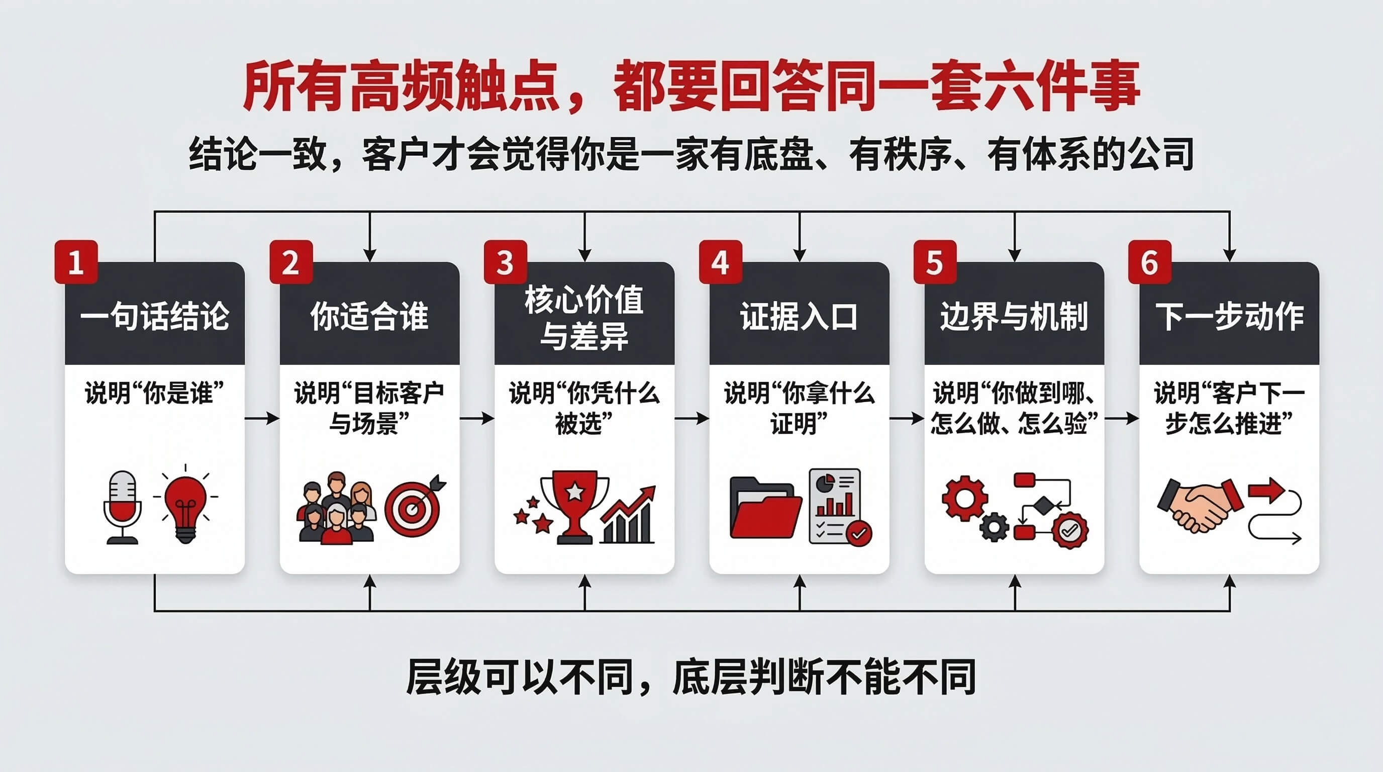 这套骨架至少要稳定回答六件事:你是谁,你服务谁,你解决什么关键问题,你凭什么被选,你做到哪、怎么做、怎么验,以及客户下一步怎么推进。不同触点的详略可以不同,但判断逻辑不能不同。