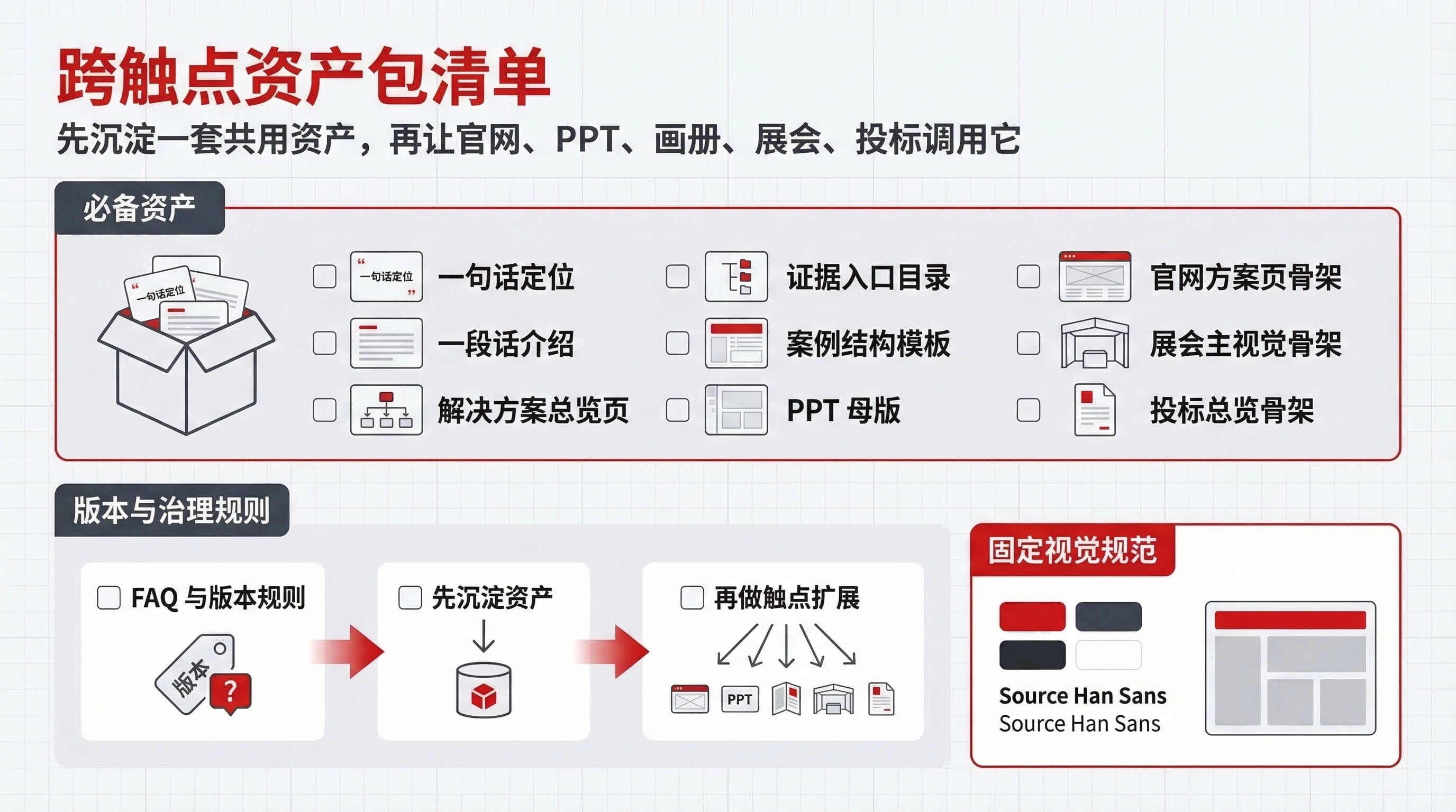 落地时最值得先沉淀的,至少包括:一句话定位、一段品牌介绍、解决方案总览页、证据入口目录、案例模板、PPT母版、官网模块规则、展会主视觉骨架、投标总览骨架以及版本更新规则。没有这套资产包,触点越多,走样越快。