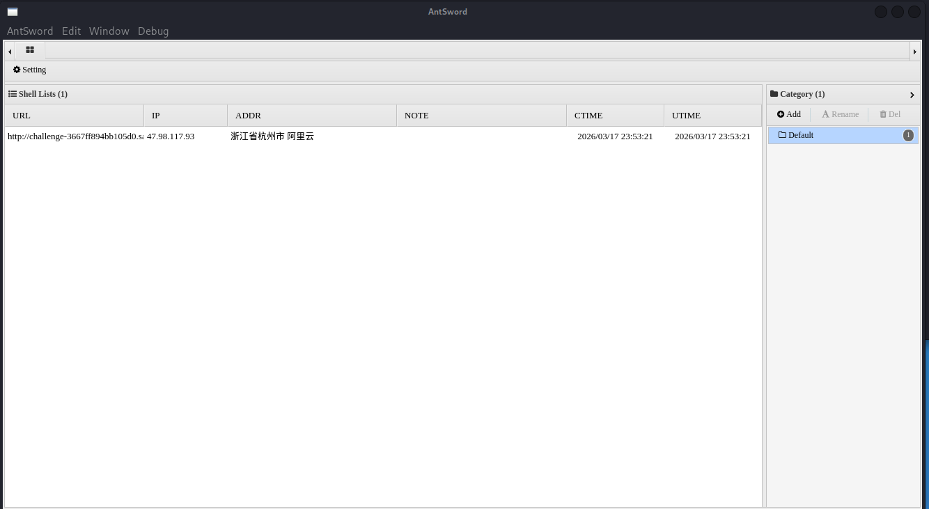 这个部分与Q1中几乎一样,打开蚁剑添加webshell连接,然后在命令行终端找到flag文件并查看源码,得到最后的答案为ctfhub{769c2a62496cb2972dfdd742}