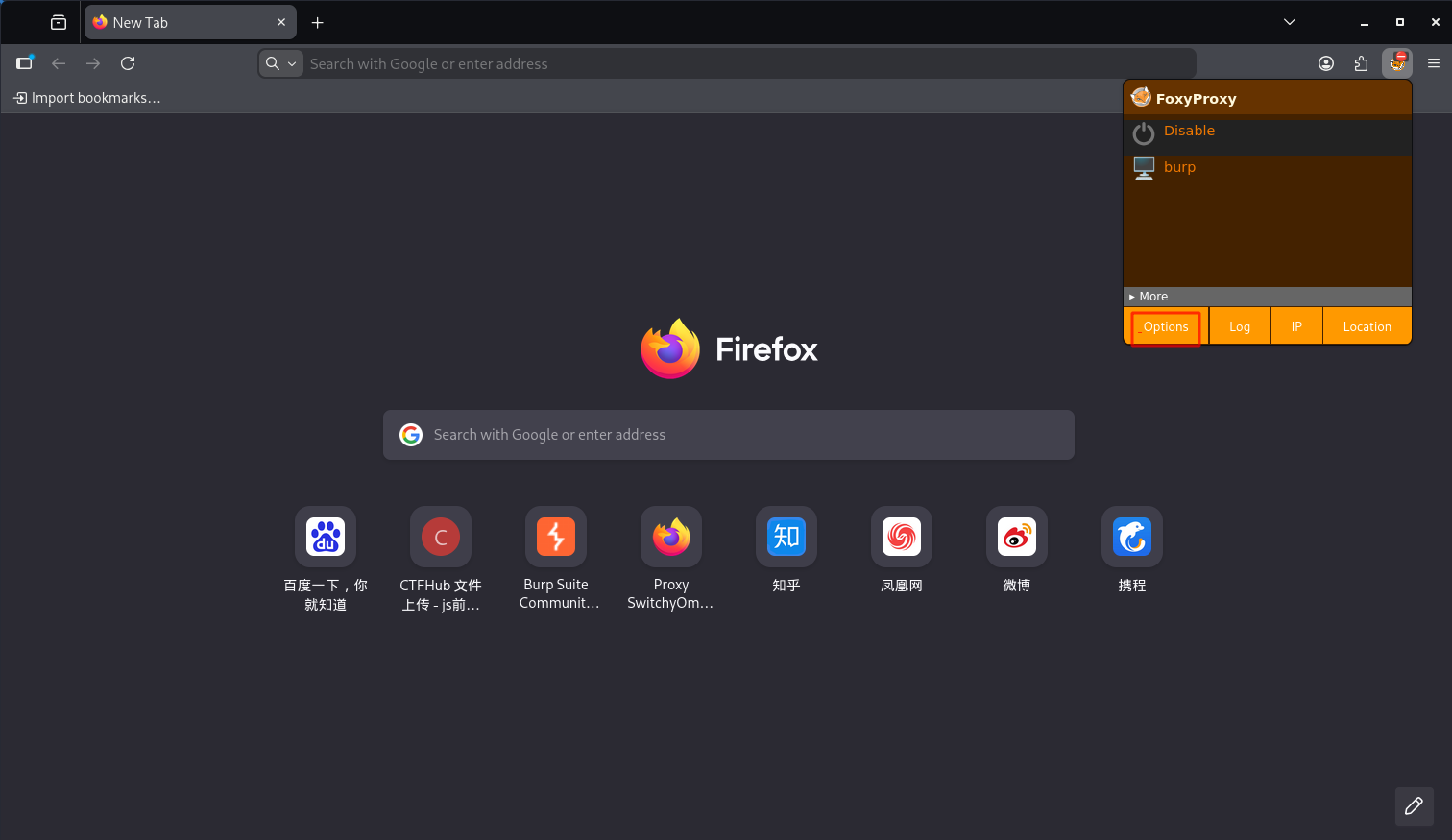 打开firfox浏览器,点击FoxyProxy插件里的options(如下图1)。在Proxies下配置一个代理burp,设置该代理的host为127.0.0.1、port为8080。