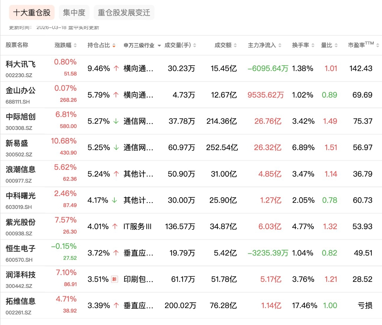 持仓层面,该ETF聚焦云计算核心龙头,十大重仓股涵盖科大讯飞、金山办公、中际旭创等优质标的。当日,新易盛涨10.68%,中际旭创、紫光股份、润泽科技涨幅均超6%,浪潮信息、拓维信息涨幅超4%,权重股集体走强成为ETF上涨的核心动力。其中,科大讯飞以9.46%的持仓占比位居第一,算力、AI应用与通信网络板块龙头形成合力,充分覆盖云计算全产业链价值。
