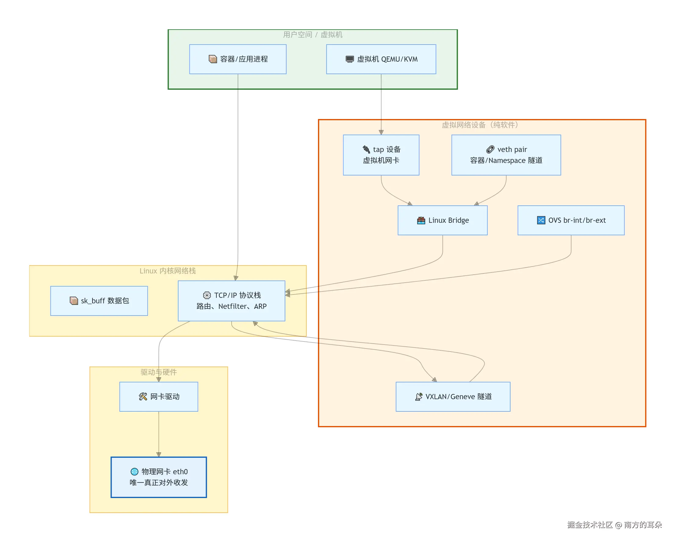 | 驱动 | 厂商硬件驱动(e1000, ixgbe, mlx5...) | 内核虚拟驱动模块 |