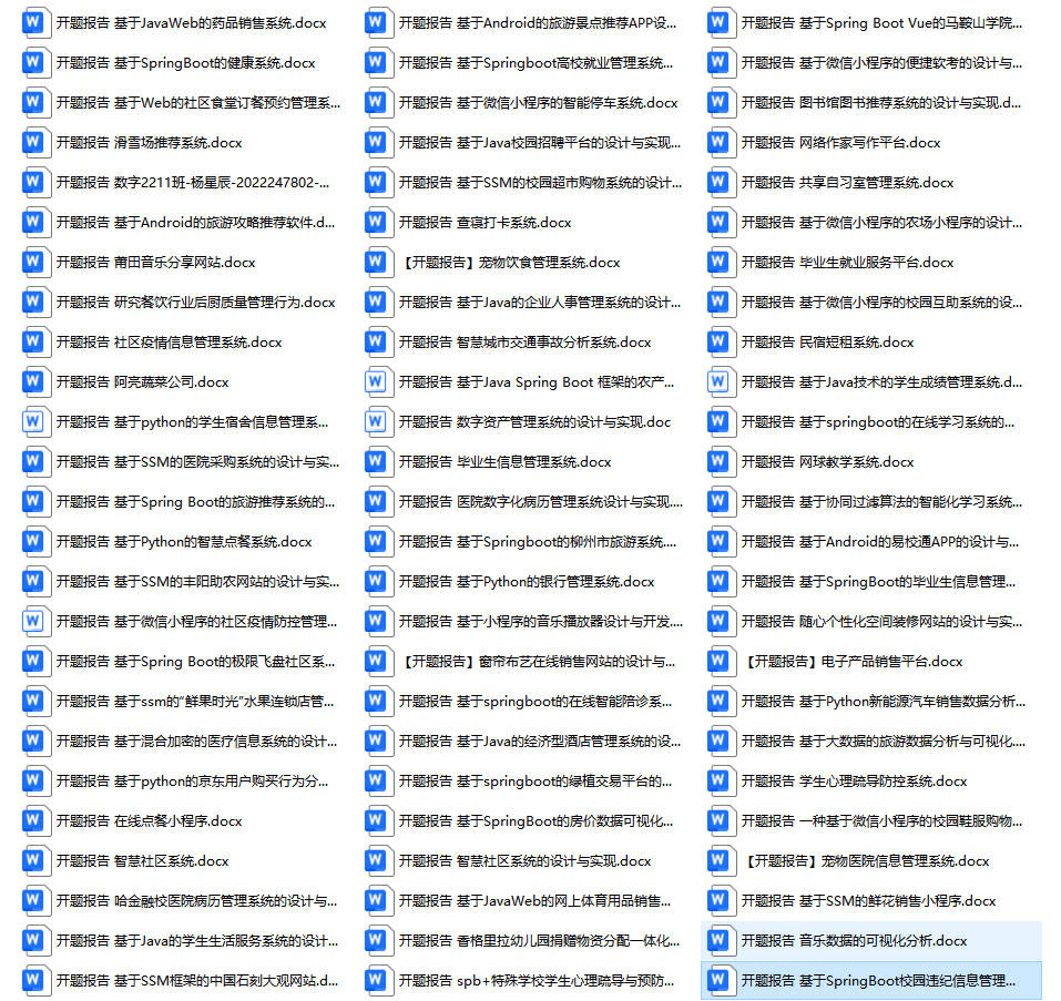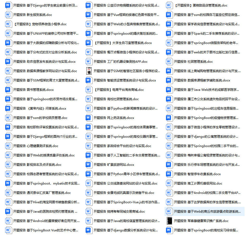 以上是某同学的毕业设计答辩的过程,如果你现在还没有参加答辩,还是开题阶段,已经选好了题目不知道怎么写开题报告,可以下面找找有没有自己符合自己题目的开题报告内容,列表中的开题报告都是往届真实的开题报告,可发送使用或参考。文末或底部来联xi可免费获取
