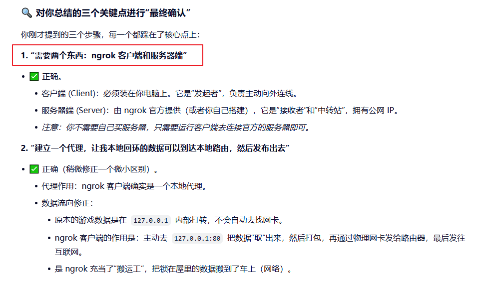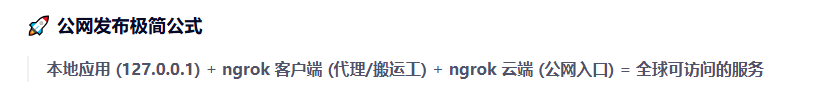 - ngrok 的聪明之处 :它利用"内网主动访问外网"这个被允许的动作,建立了一条反向通道。一旦通道建立,外网的数据就可以顺着这条"合法"的通道溜进来,直达你的本地应用。