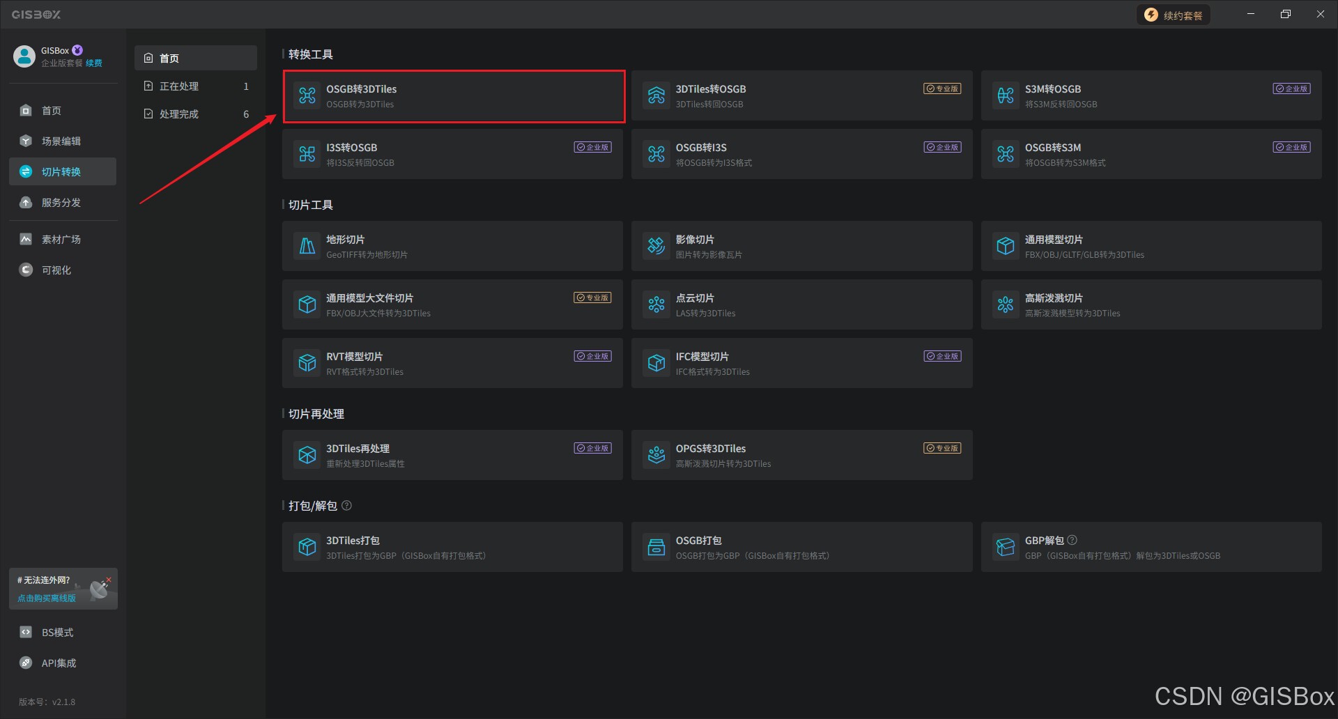 1、首先,打开GISBox的****"切片转换"**** 模块,在****"转换工具"**** 中选择****"OSGB转3DTiles"****。