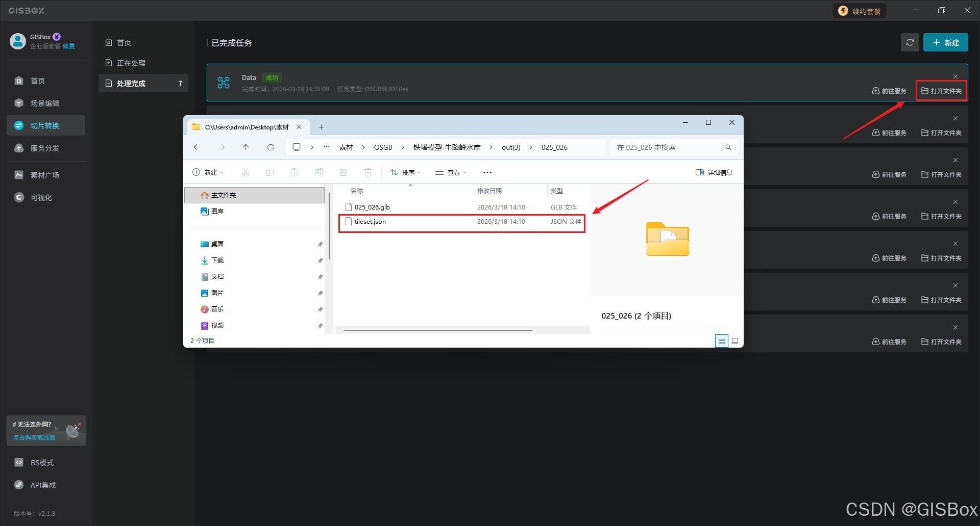 5、转换成功后,点击****"打开文件夹"****,可以看到转换后的3DTiles格式文件。