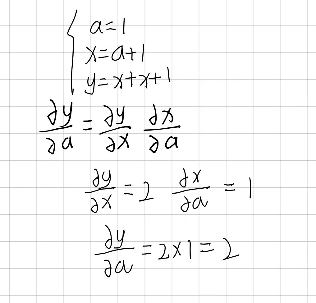 我们的核心目标是求解 y 对 a 的偏导数 ∂y/∂a,这一过程需依托多元函数偏导的链式法则完成(计算图反向传播求解梯度的核心逻辑也源于此)。