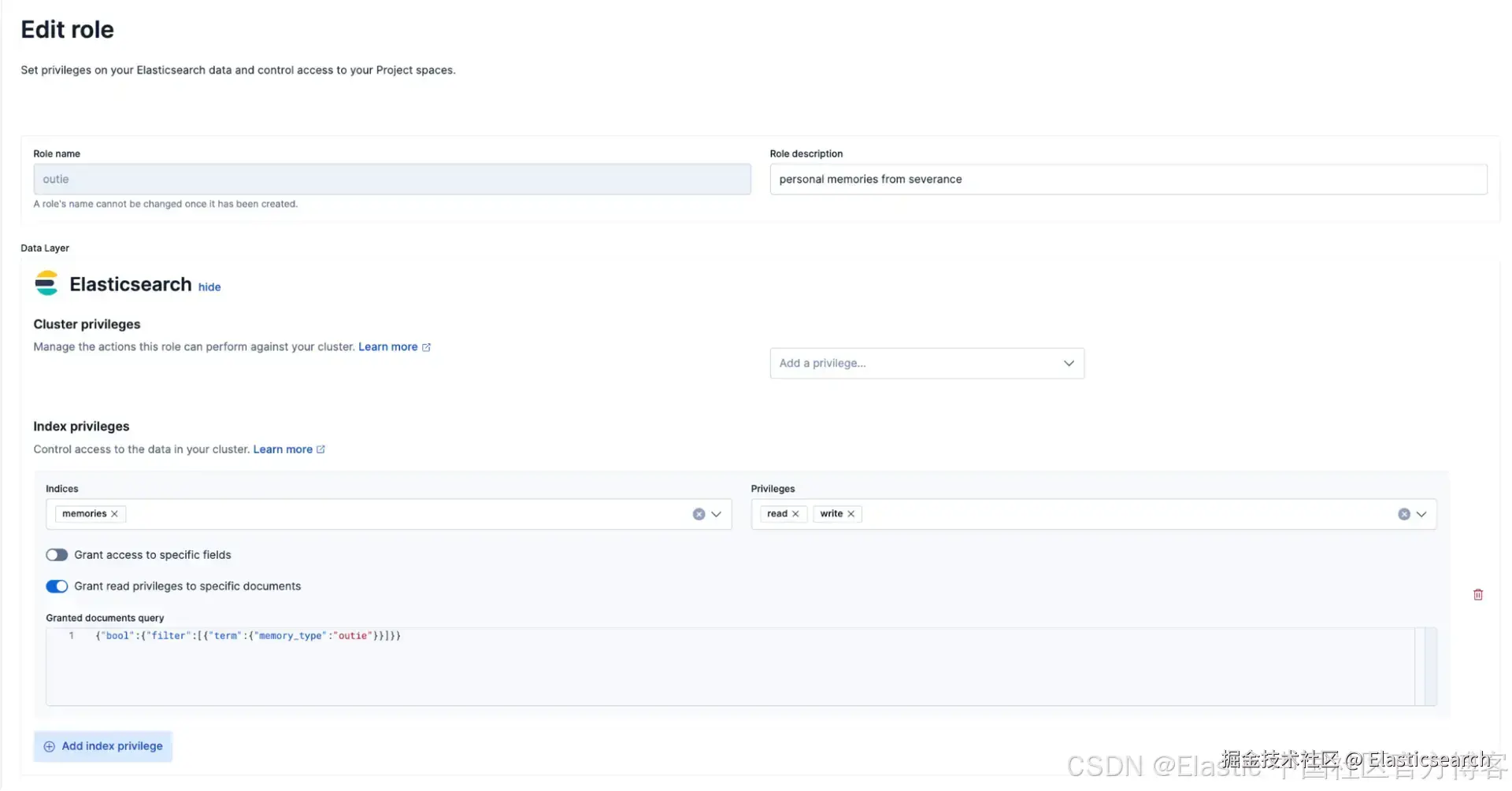 这是使选择性记忆生效的关键部分。我们创建两个独立的角色:一个用于 innies ,一个用于 outies,每个角色都内置了查询级别的过滤器。当具有 innie 角色的用户查询 memories 索引时,Elasticsearch 会自动应用过滤器,仅返回 memory_type 等于 "innie" 的记忆。