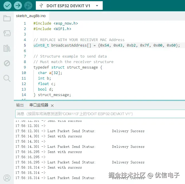 上传发送方和接收方的程序到ESP32开发板,打开两个串口助手分别显示发送方和接收方的打印结果情况 ESP32发送方:发送结构体struct_message数据并显示发送成功