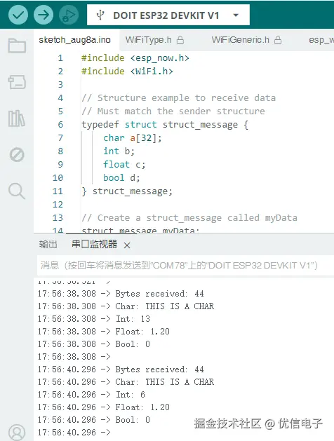ESP32接收方:显示接收到的发送方发送的结构体struct_message的具体数据