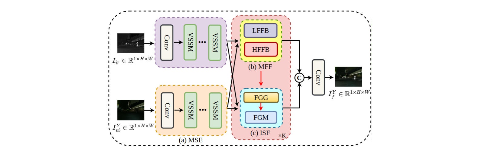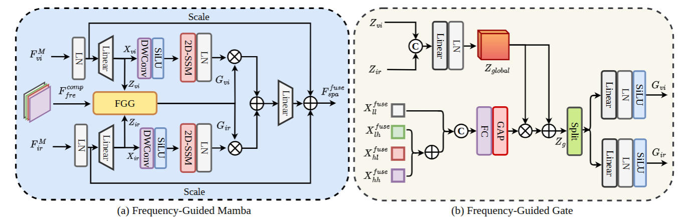 作者认为现有多模态图像融合方法(MMIF),在频率域应用方面未实现多尺度高低频的自适应整合,高频噪声抑制效果不佳。同时,Mamba能以线性计算复杂度建模图像的长距离依赖,为 MMIF 提供了高效的特征提取方案。