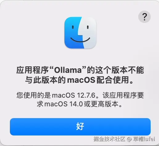 双击后提示系统需要升级至少到 macOS 14,沃日啊,各种不兼容,直接把 Ollama 卸了,不用了,本地运行小模型现在的设备支持也有点吃力