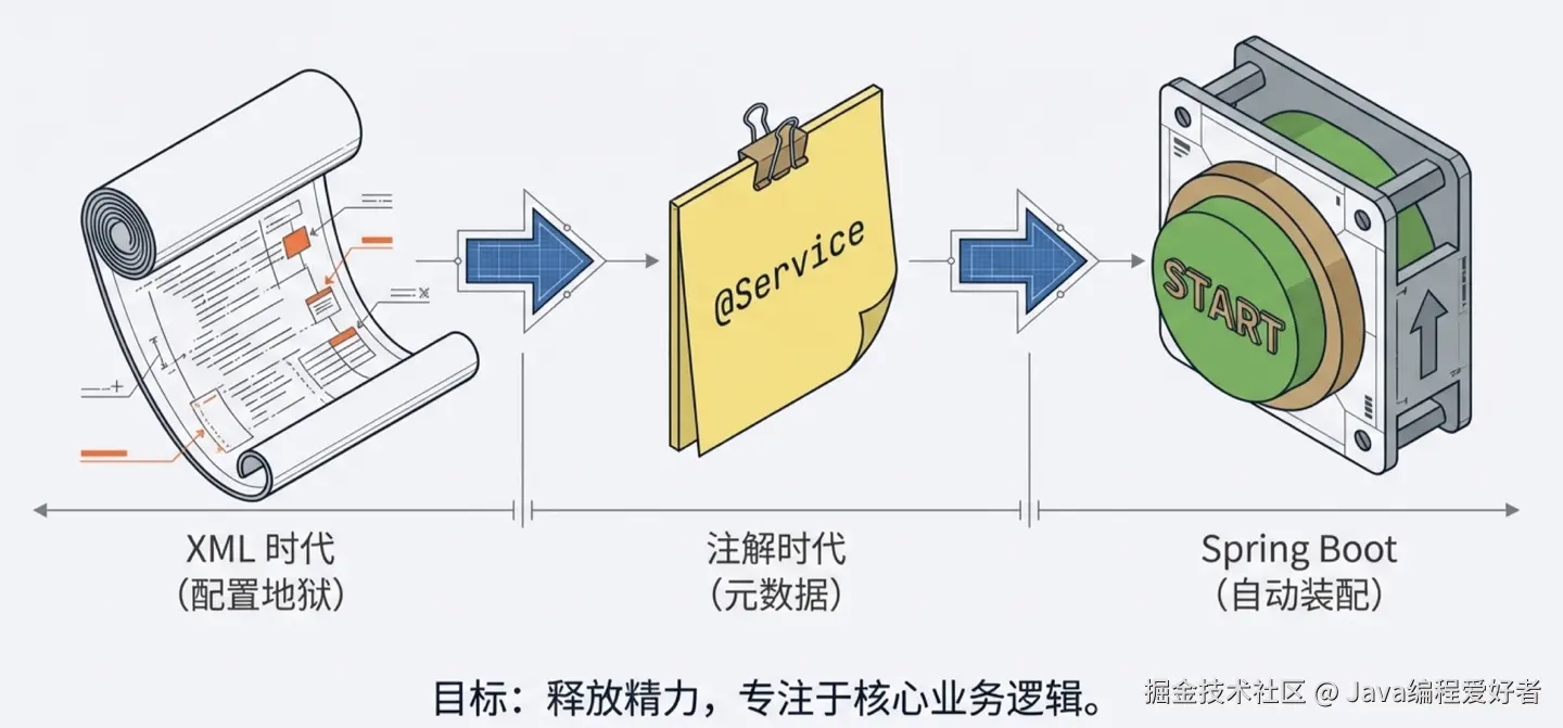 从 XML 的笨重,到注解的灵活,再到 Boot 的全自动装配,Spring 所有的演进都只为了一件事:让那些和核心业务无关的技术底座(对象的创建、依赖、环境装配)彻底隐形。 只有把开发者的心智负担降到最低,我们才能把全部精力倾注到真正的业务逻辑上。