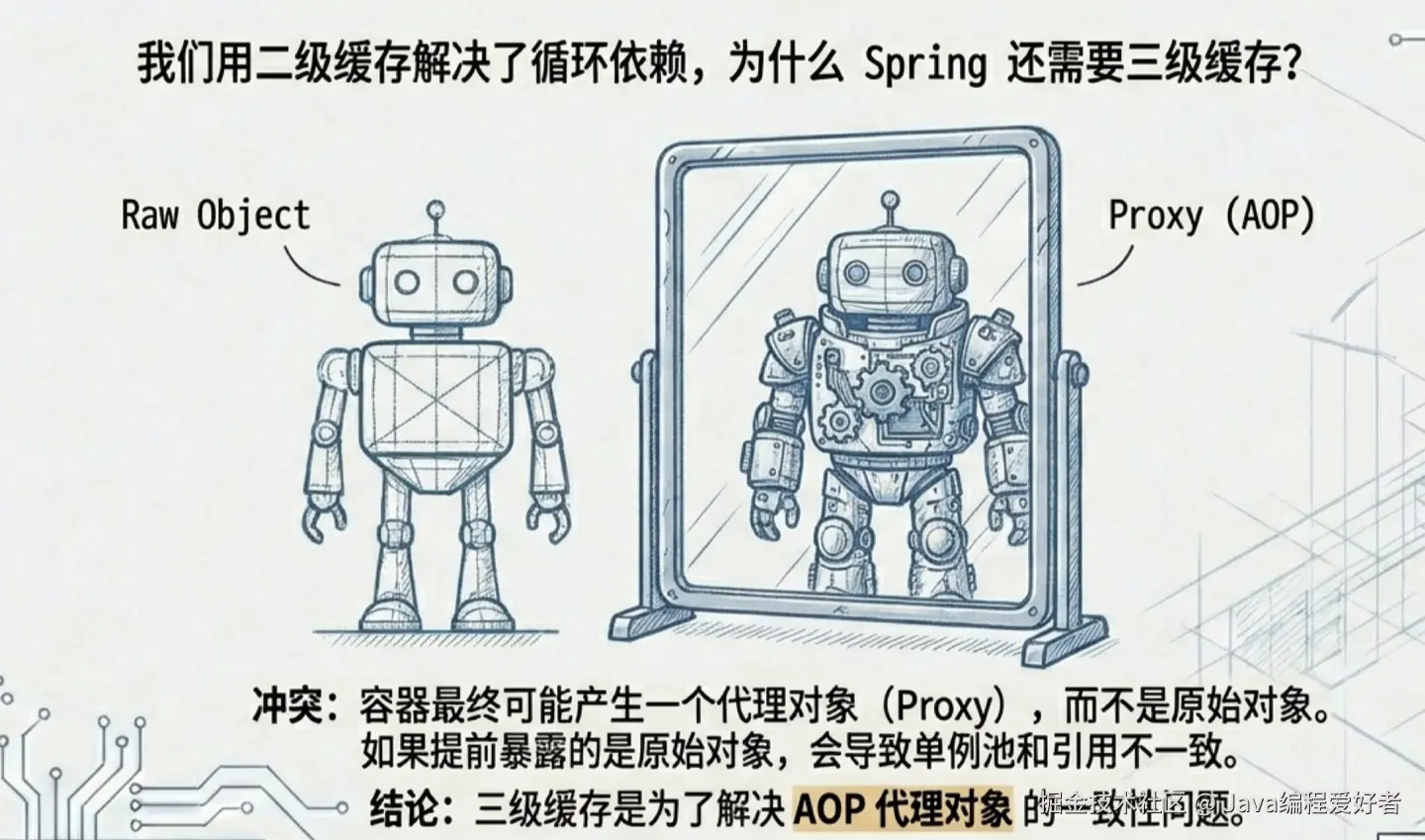这个细节留到下一篇 AOP 专场再细盘------但你现在至少知道:三级缓存不是为了凑数,是被 AOP 逼出来的。