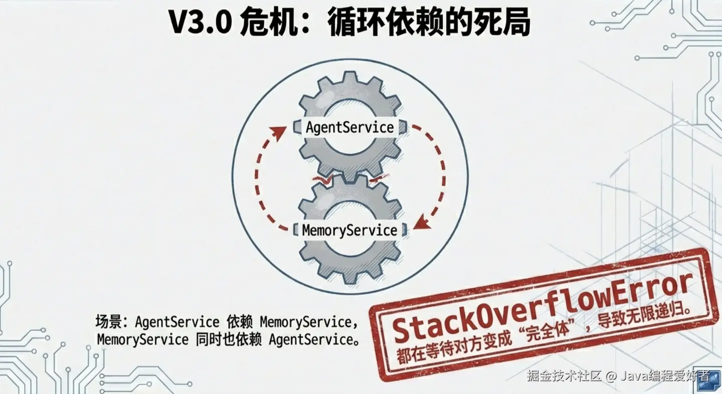 假设现在 MemoryService 在更新完记忆后,需要调用 AgentService 的状态上报方法。也就是说,MemoryService 里也 @Autowired 了一个 AgentService。
