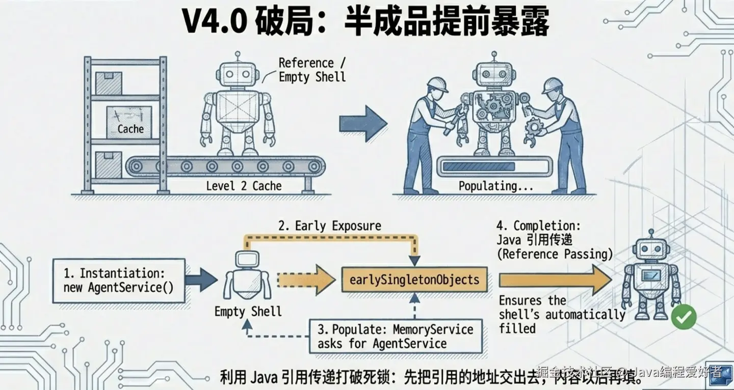 AgentService的空铁壳子后,立刻把它扔进二级缓存! - 属性填充(populateBean) :A 发现缺 B,去造 B。B 发现缺 A,去缓存里找。