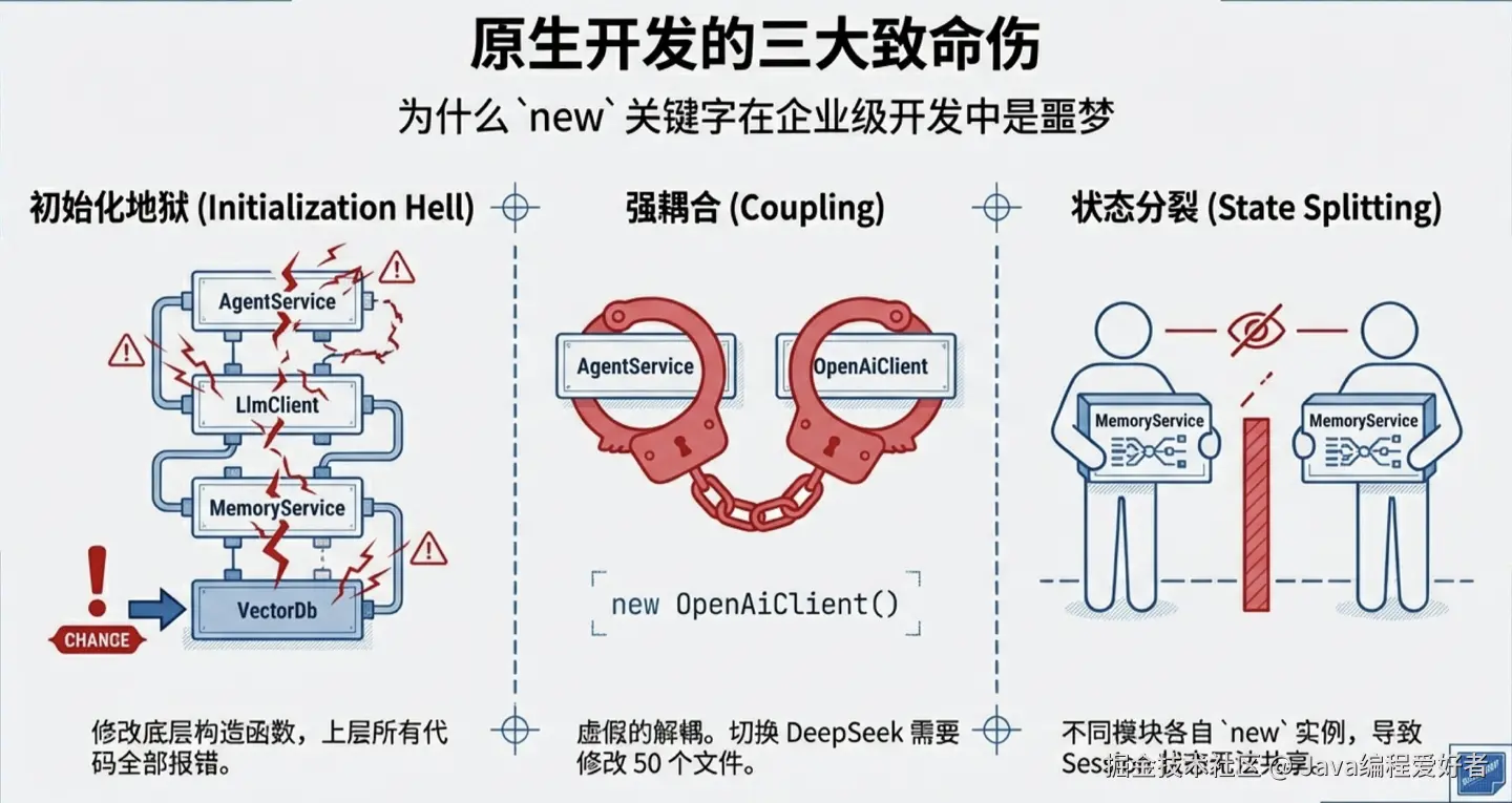 错!这只是一种虚假的解耦。 接口确实解决了"多态调用"的问题,但它根本没有解决"对象创建权"的问题。只要你的代码里出现了 new OpenAiClient() 这个确切的类名,你的 AgentService 就被这个具体实现死死绑架了。当你要换成 DeepSeekClient 时,你依然得捏着鼻子打开 AgentService.java 的源码,去修改那行 new 的代码。如果系统里有 50 个地方用到了大模型,你就得改 50 个地方。真正优雅的解耦,是 AgentService 压根不需要知道具体的实现类是谁,只要别人给我一个符合标准的接口就行。