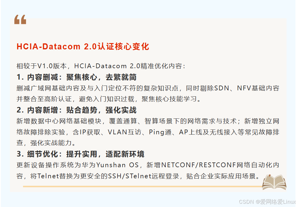 此次更新不仅是版本迭代,更是对数通领域入门级人才能力标准的一次全面重塑,标志着认证内容向 "实战化、智能化" 方向的深度演进。