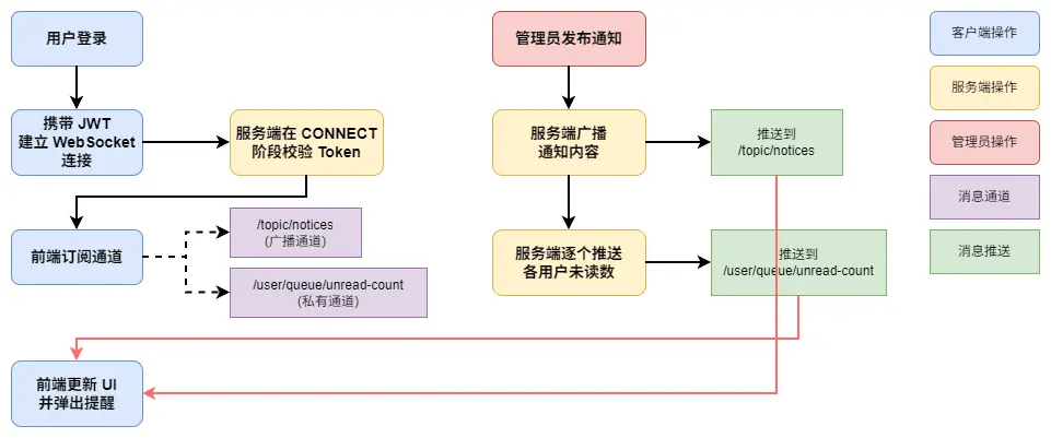 消息模型上,通知内容是公共信息,使用 /topic 广播;未读数是用户私有状态,通过 /user/queue 精准推送。