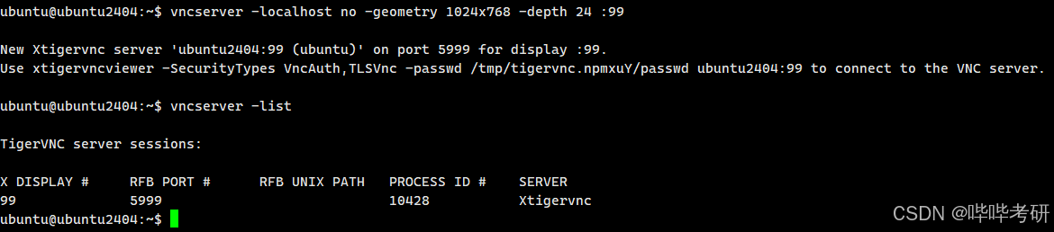 vncserver -localhost no -geometry 1024x768 -depth 24 :99这里为什么是99,而不是常见的1,因为ubuntu24 默认使用1-10,请不要使用这几个数字,最好从50开始测试;