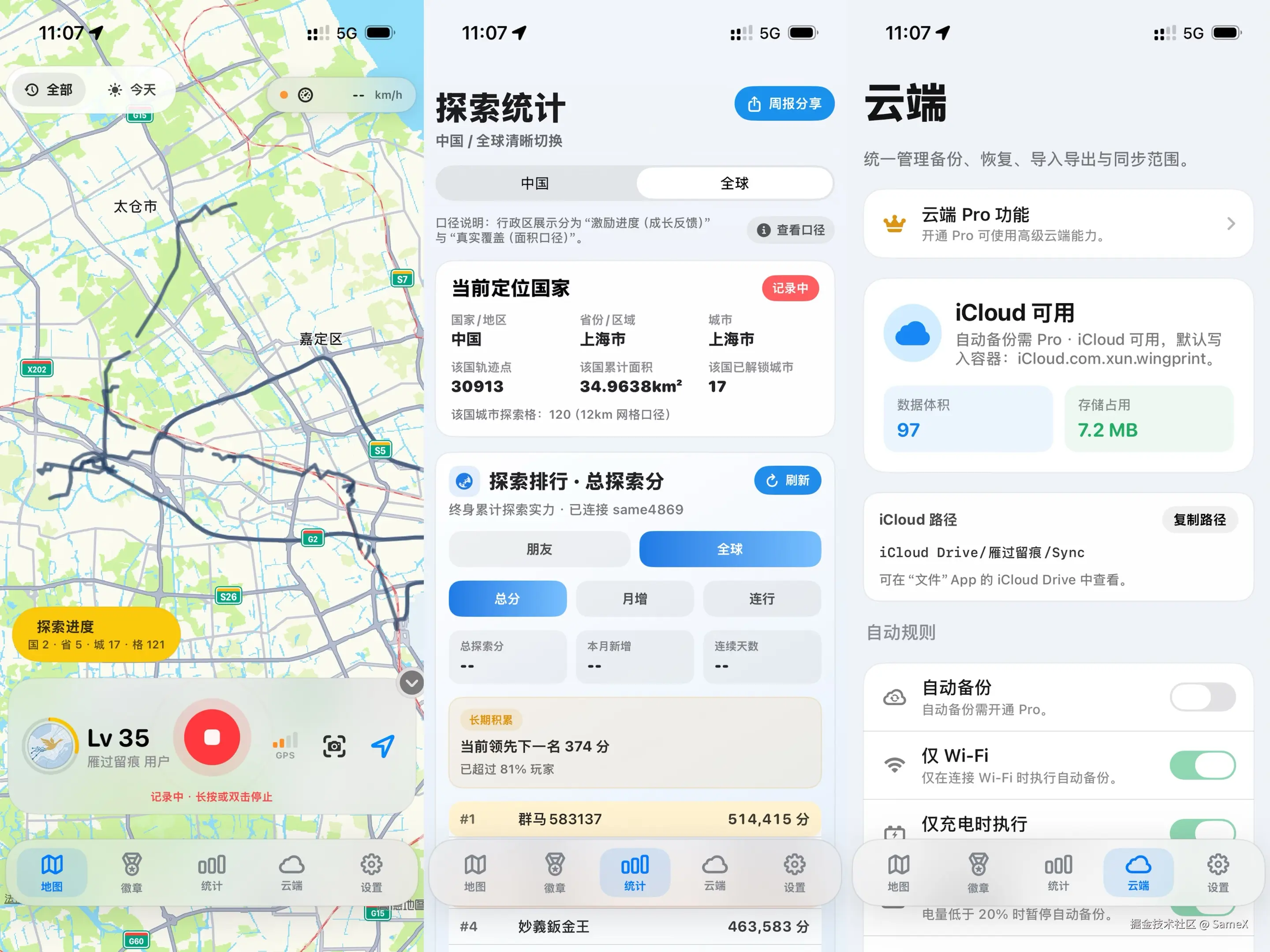 它现在做的事并不复杂:记录轨迹、沉淀里程和覆盖范围、给出等级和解锁反馈、支持分享,也支持导入、导出、备份、恢复、回滚。