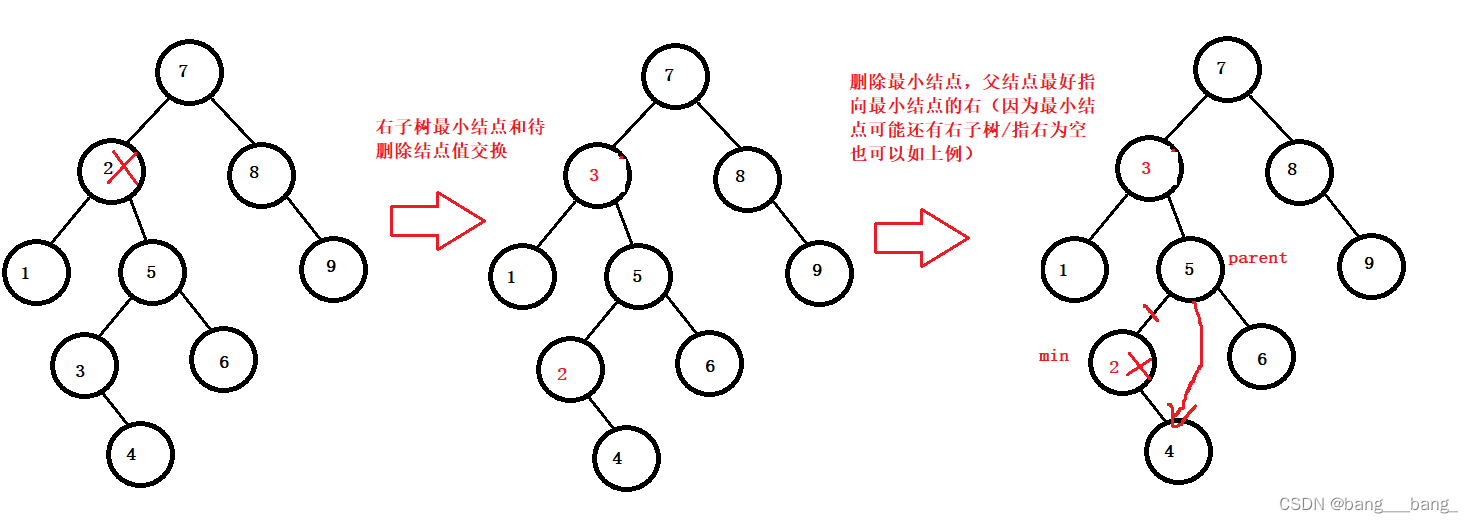 b:待删除的结点有左右孩子:采用替换法,寻找删除结点右子树的最小结点(右子树最左结点),将最小结点的值和删除结点的值替换,然后删除最小结点(此时最小结点,要么没有孩子,要么只有一个孩子,符合a情况可以直接删除)