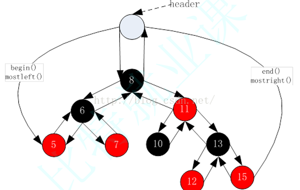 STL明确规定,begin()与end()代表的是一段前闭后开的区间,而对红黑树进行中序遍历后, 可以得到一个有序的序列,因此:begin()可以放在红黑树中最小节点(即最左侧节点)的位 置,end()放在最大节点(最右侧节点)的下一个位置,关键是最大节点的下一个位置在哪块? 能否给成nullptr呢?答案是行不通的,因为对end()位置的迭代器进行--操作,必须要能找最 后一个元素,此处就不行,因此最好的方式是将end()放在头结点的位置: