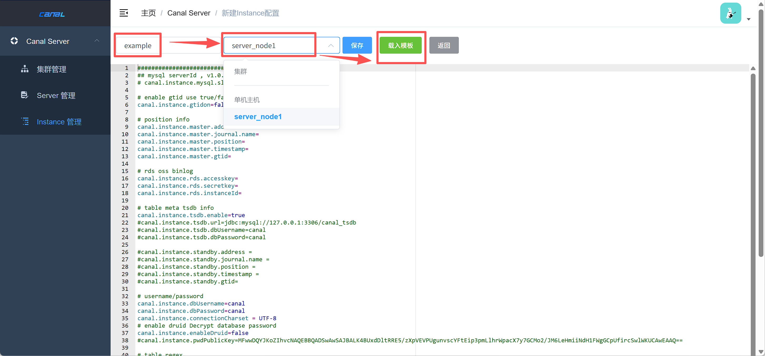 分别定义对应该 Instance 的名称(此处示例名称为 example),再选择其所属 Server 服务,然后再点击"载入模板",最后按需调整相关参数。
