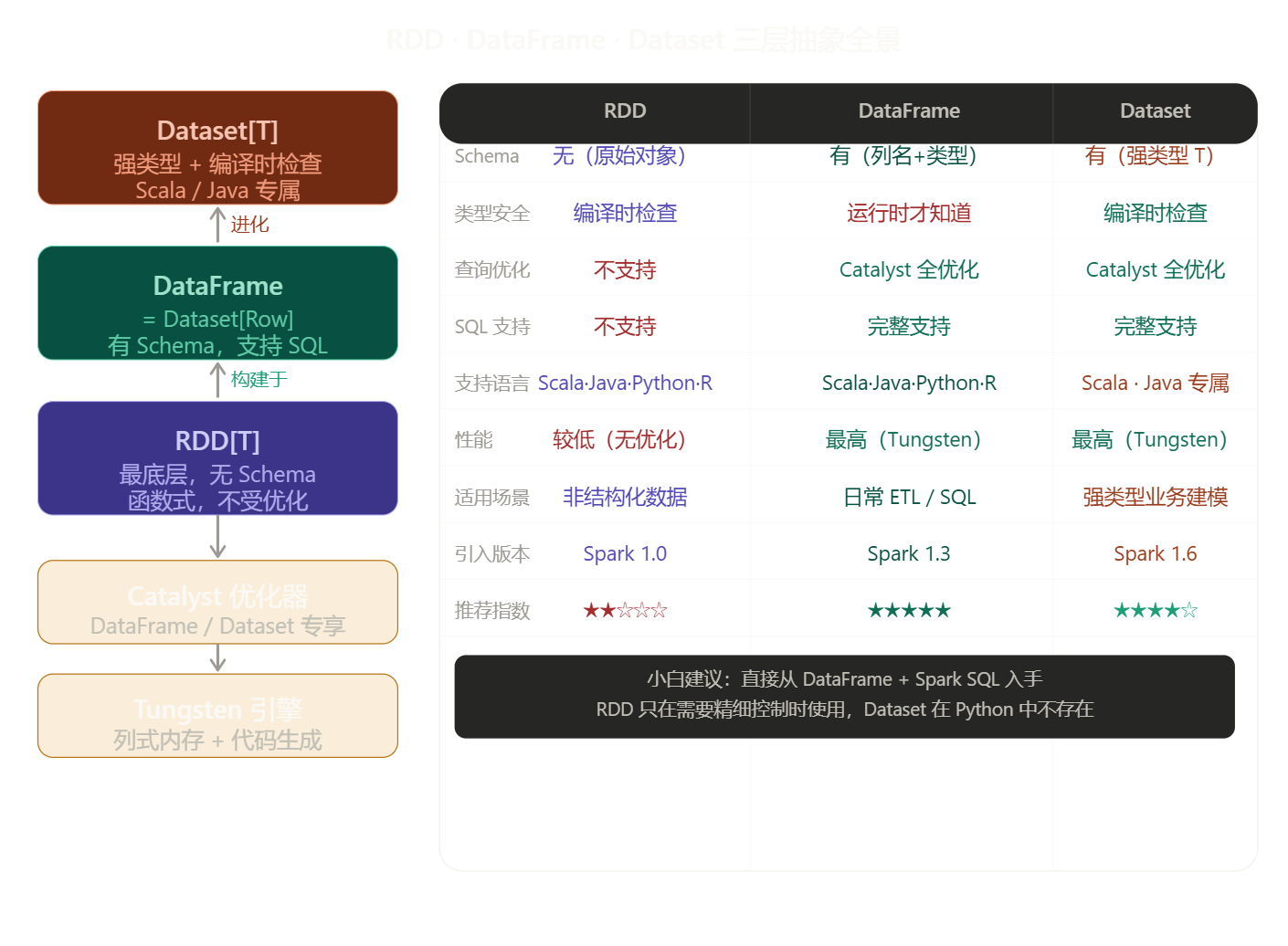 三大抽象对比(图三) --- 对初学者最实用的结论是:直接用 DataFrame + Spark SQL,不要纠结 RDD。DataFrame 有 Schema、有 Catalyst 优化器、有 Tungsten 列式内存引擎,性能比手写 RDD 高很多,而且代码简洁十倍。RDD 只在处理非结构化数据(如图片字节流、自定义序列化对象)或需要精细控制执行行为时才有必要。Dataset 是 Scala/Java 专属,Python 用户完全不需要关心。