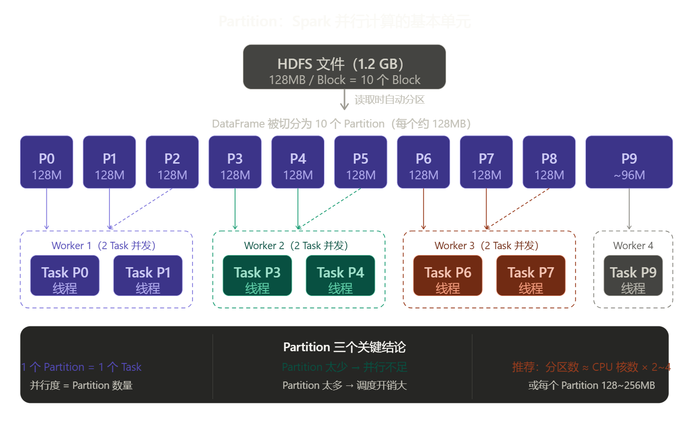 Partition 并行模型(图四) --- Partition 是 Spark 并行的最小单位,一个 Partition 对应一个 Task,一个 Task 跑在一个线程上。1.2GB 的文件默认被切成约 10 个 128MB 的分区,分发给各 Worker 上的 Executor 并行处理。分区数太少,机器核数用不满;分区数太多,Task 调度开销反而变大。实际经验是每个分区保持 128~256MB,分区总数约等于集群 CPU 总核数的 2 ~ 4 倍。