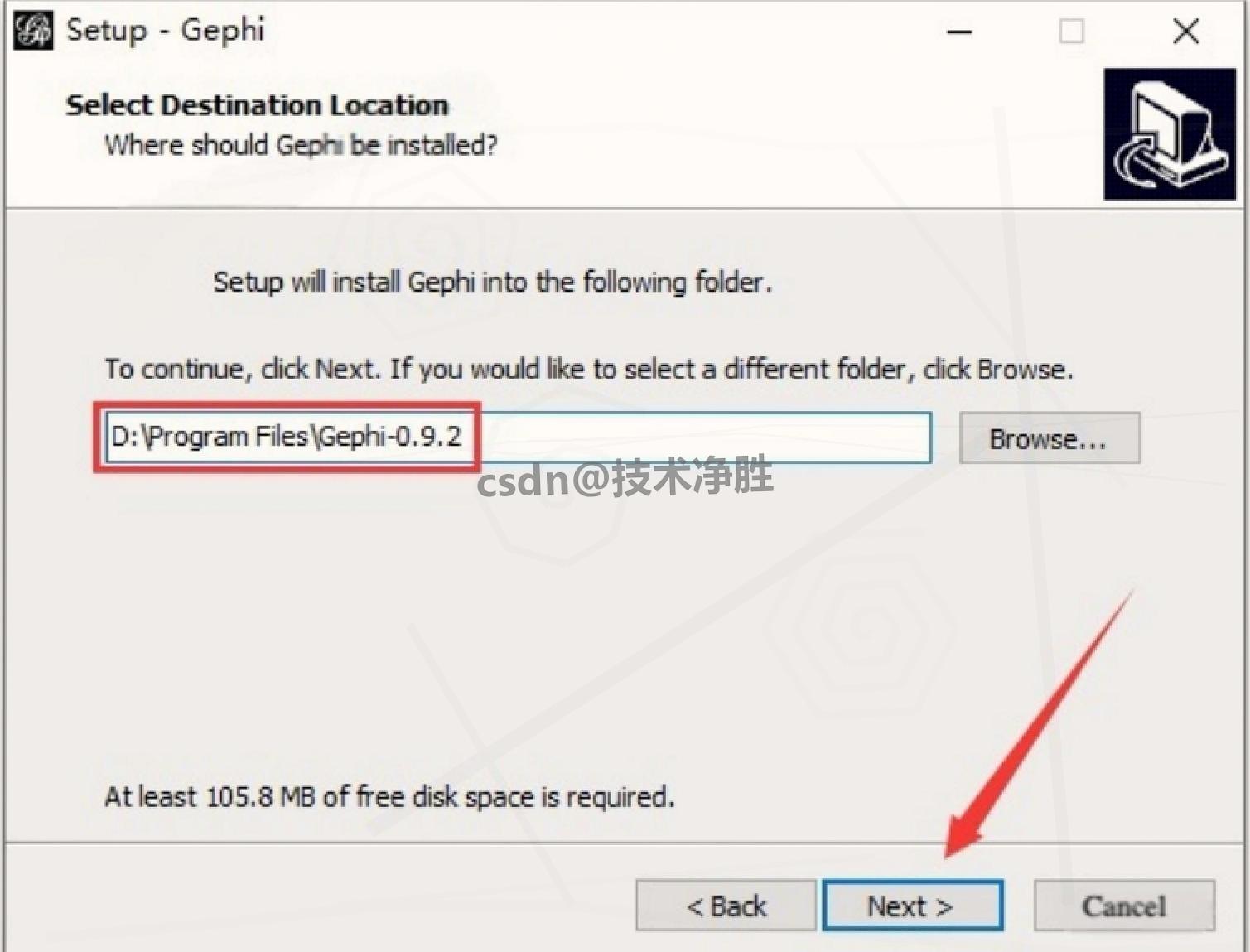 8.选择安装路径 :默认路径为 "C:\Program Files\Gephi-0.9.2",如需更改,直接修改路径首字符(如将 "C" 改为 "D",即 "D:\Program Files\Gephi-0.9.2"),点击 "Next";