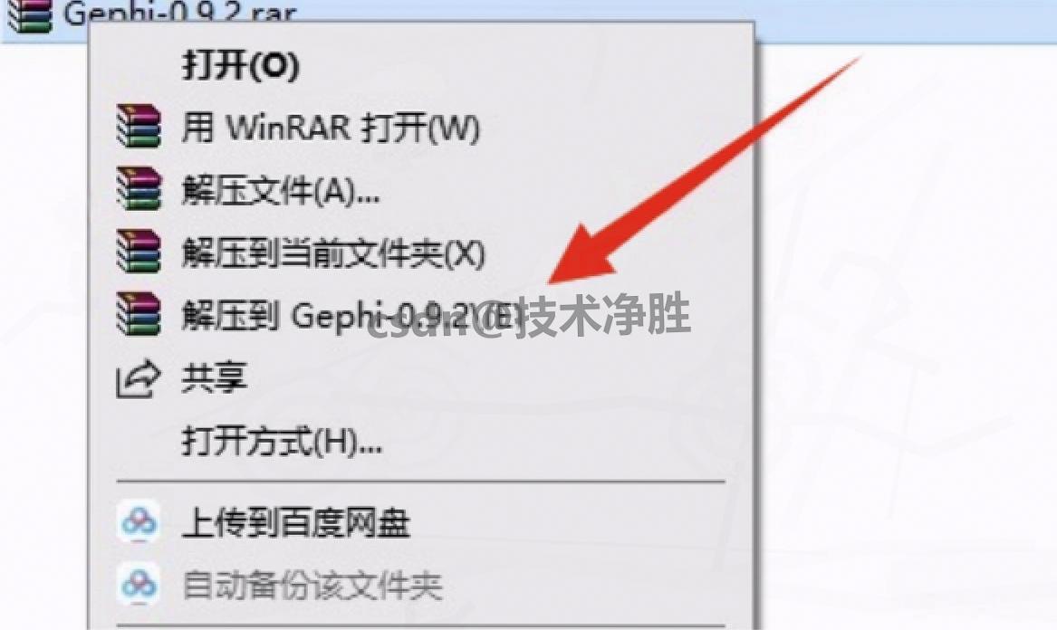 1.解压安装包 :找到下载的 ZIP 压缩包(如 "gephi-0.9.2-windows.zip"),右键选择 "解压到当前文件夹",生成名为 "gephi-0.9.2" 的文件夹;
