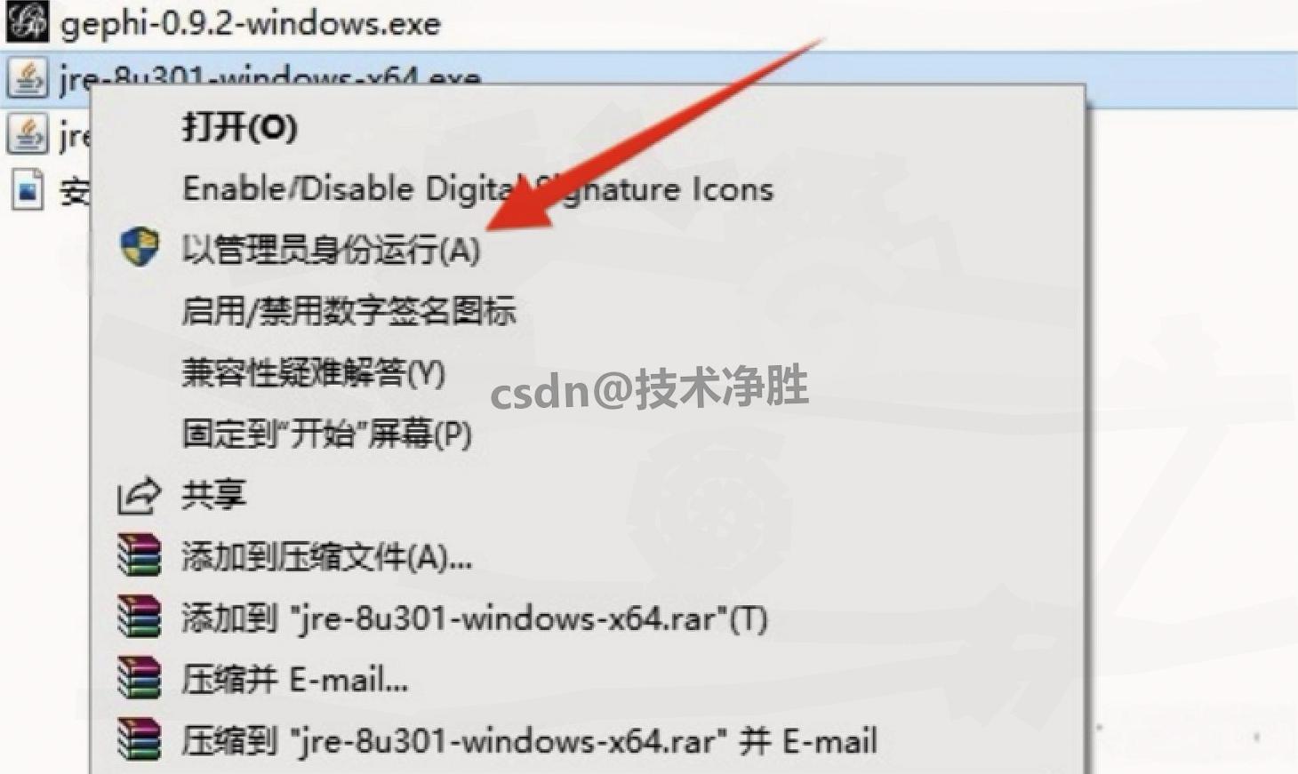 2.安装 JRE 环境 :进入解压文件夹,找到 "jre-8u144-windows-x64.exe"(Gephi 依赖 Java 运行环境),右键选择 "以管理员身份运行";