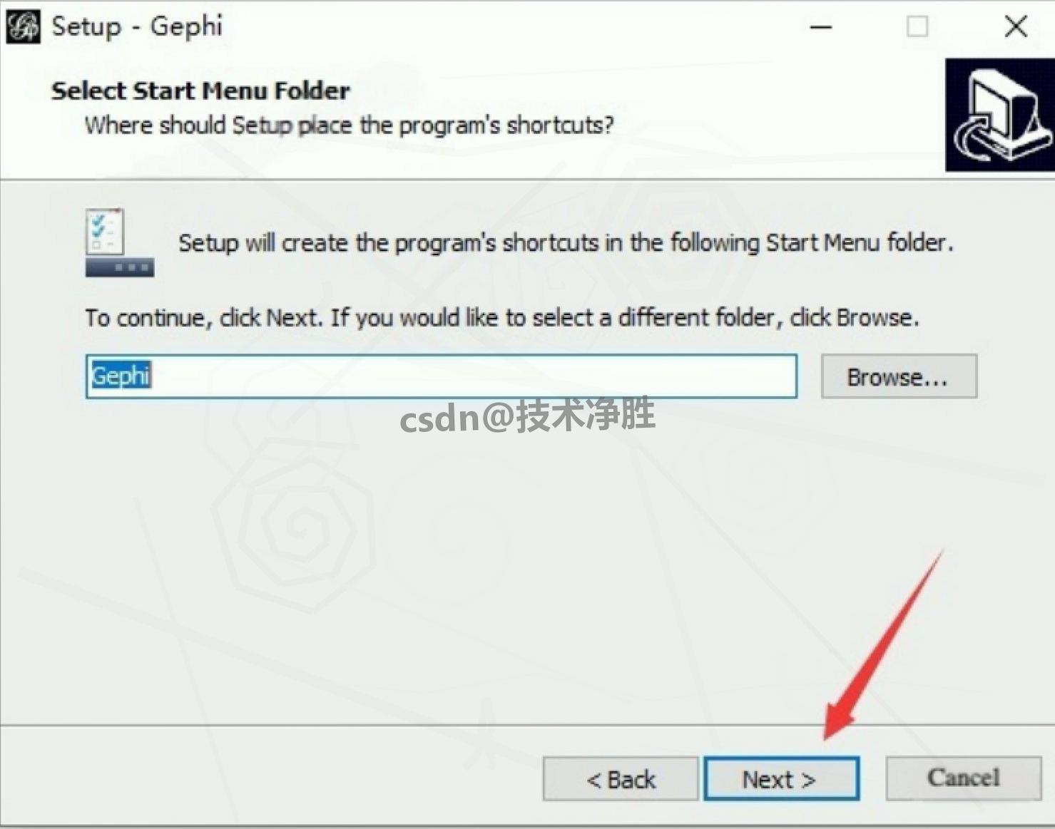 10.确认开始菜单文件夹 :默认文件夹为 "Gephi 0.9.2",无需修改,点击 "Next";