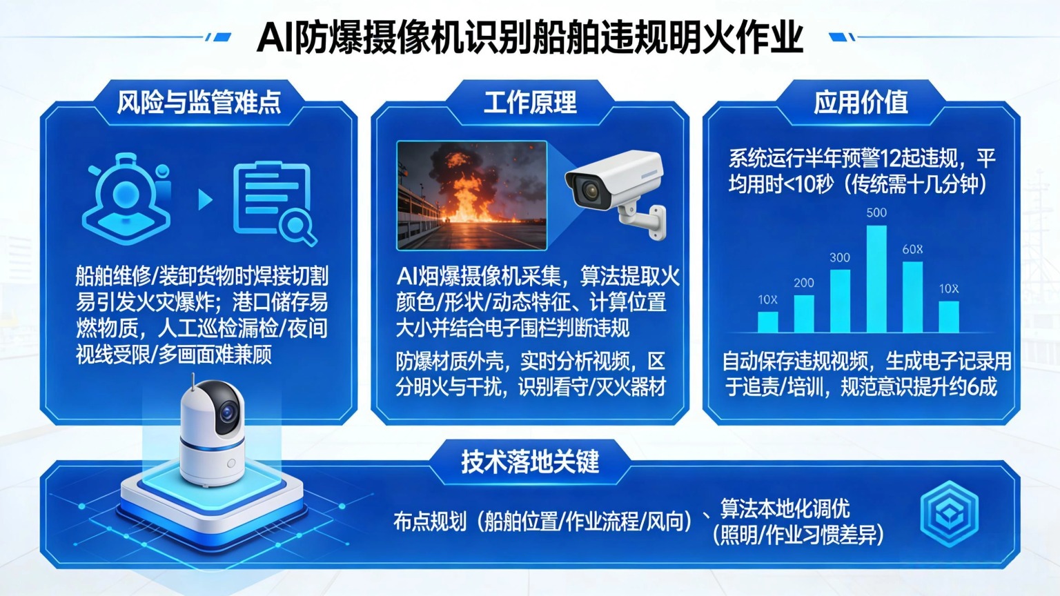 港口和船舶作业是高风险行业,明火作业更是安全管理中的重点监控对象。传统的人工巡检方式存在视野盲区、反应滞后等问题,而AI防爆摄像机的出现,正在改变这一局面。